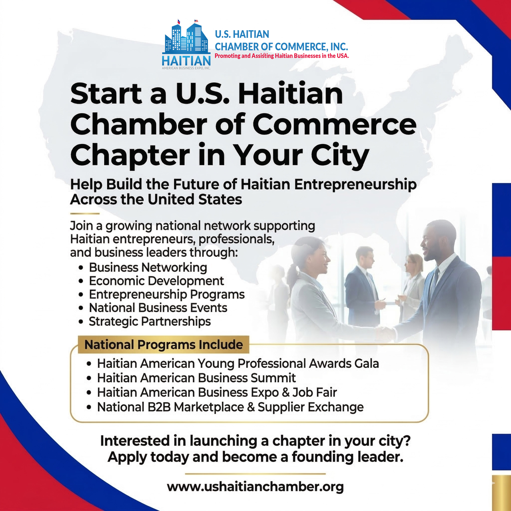 Help Strengthen Haitian Entrepreneurship in Your Region The U.S. Haitian Chamber of Commerce is the leading Haitian business association in the United States, now approaching 10 years of impact, with a proven track record of advancing Haitian-owned and diaspora-connected businesses nationwide. Our national programs include the B2B Marketplace & Supplier Exchange, the Annual Haitian American