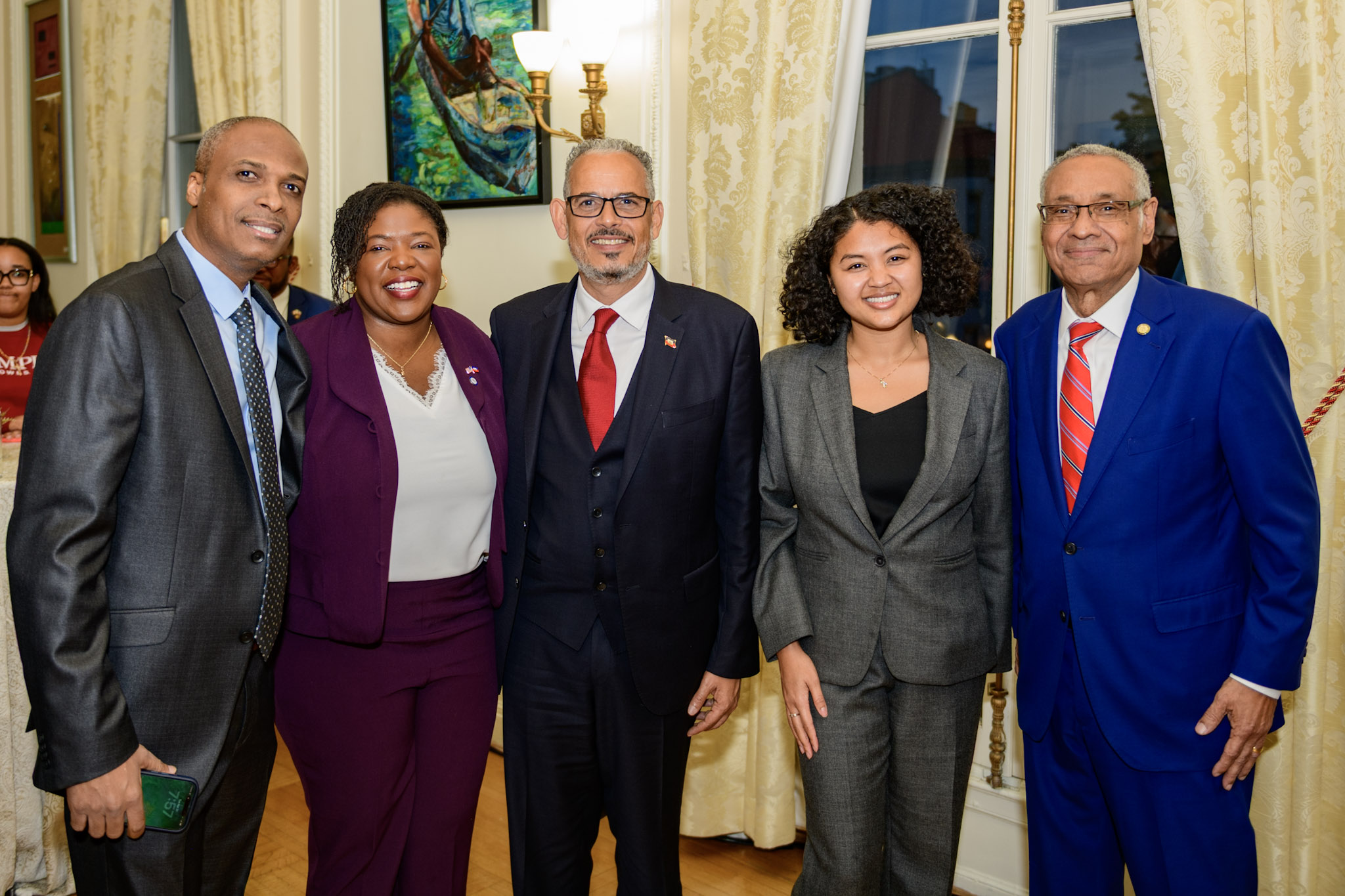 During the reception, Dr. Domercant had the opportunity to engage with several distinguished leaders and dignitaries, including H.E. Alix Didier Fils-Aimé, Prime Minister of Haiti; Michael Jensen, Special Advisor to the President for Western Hemisphere Affairs; Ambassador Henry T. Wooster, Chargé d’Affaires of the Embassy of the United States of America; and Camilo Tovar, Division Chief, Caribbean III Mission Chief for Haiti at the International Monetary Fund, along with many other notable ambassadors, diplomats, officials, and Haitian community leaders, and Boston City Councilor Ruthzee Louijeune.